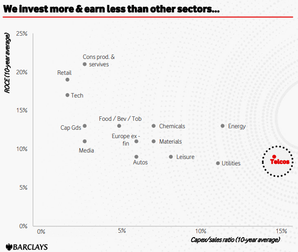 In 2023, Vodafone published research from Barclays that showed the ratio of capital expenditure to sales was the highest of any industry. The sector also had one of the lowest returns on capital employed (ROCE).
