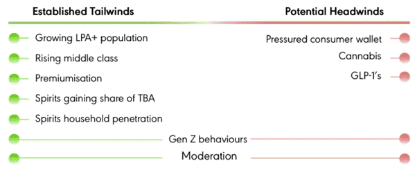 But over the past four years, the groupâs seen a decline in its sales volumes. It says this reflects a trend towards drinking better not more. In other words, people are trading up and buying more expensive brands. For example, from 2014-2024, the share of the spirits market accounted for by premium labels increased from 26% to 35%.