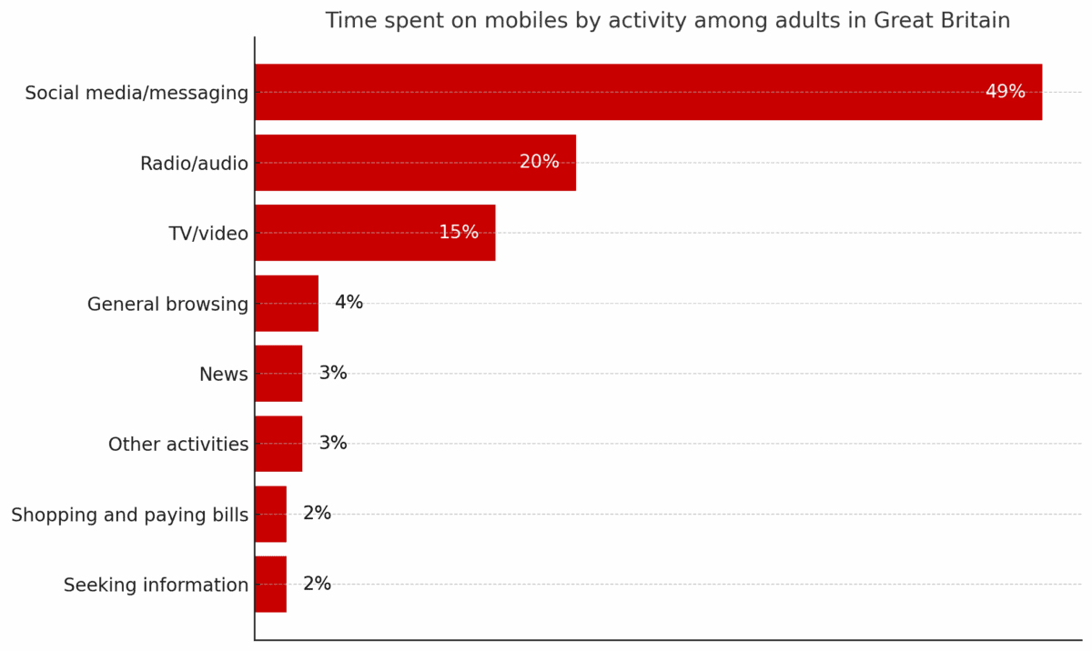 In ITV’s case, there’s the legacy TV broadcasting side and the Studios division. The former is in decline. For evidence, consider a recent TouchPoints survey, which found that adult Brits now spend more time on phones than watching TV. And on phones, they’re not watching films/series too much.