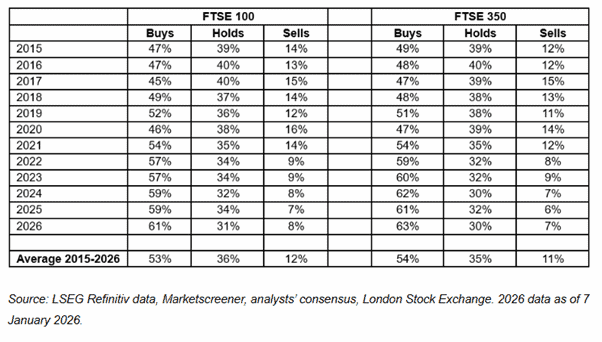 In my opinion, these are just two interesting UK shares. And as the table below shows, analysts appear optimistic about the prospects for the majority of stocks on the FTSE 100 and FTSE 350, with Buy recommendations of 61% and 63%, respectively.