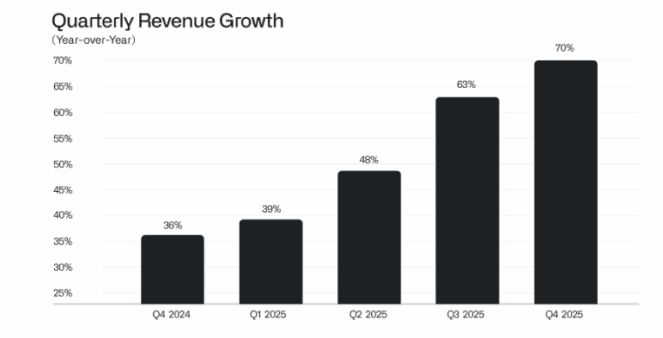 The firm’s customers range from dozens of blue-chip companies to the FBI, CIA, and NHS. And in Q4 2025, its customer count grew 34% year on year, as it closed 180 deals valued at no less than $1m, 84 deals of at least $5m, and 61 at $10m or more.