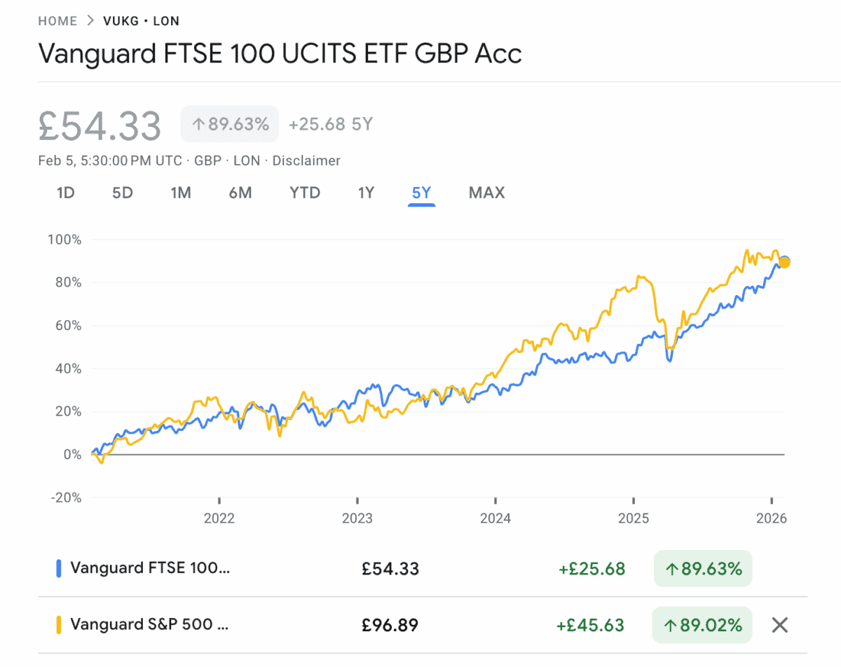 One good week doesnât make up for years of relative underperformance. The latest moves, though, mean the total returns from the FTSE 100 and the S&P 500 are roughly level over the last five years.