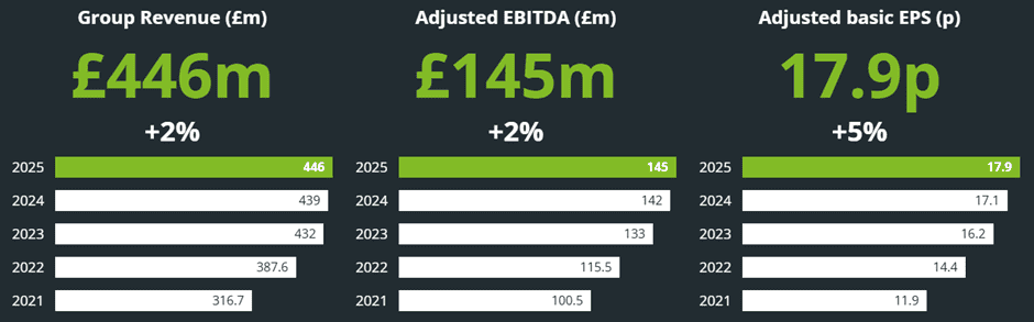 Since the pandemic, the groupâs been steadily growing its revenue and earnings. Comparing 2025 with 2021, turnover was up 40.8% and adjusted basic earnings per share (EPS) was 50.4% higher. Over the same period, it raised its dividend by 7.9% in cash terms.