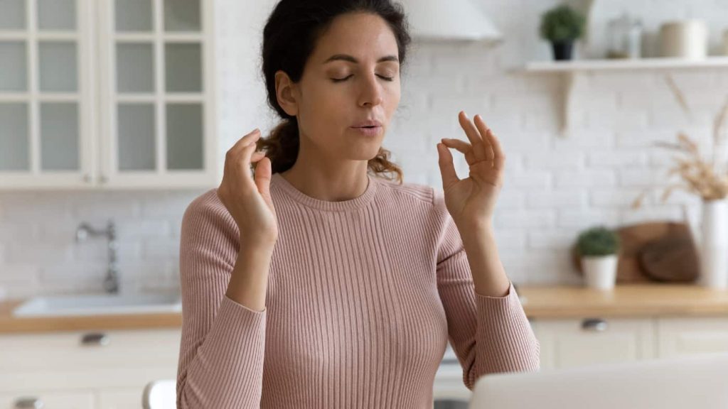 Mindful young woman breathing out with closed eyes, calming down in stressful situation, working on computer in modern kitchen.