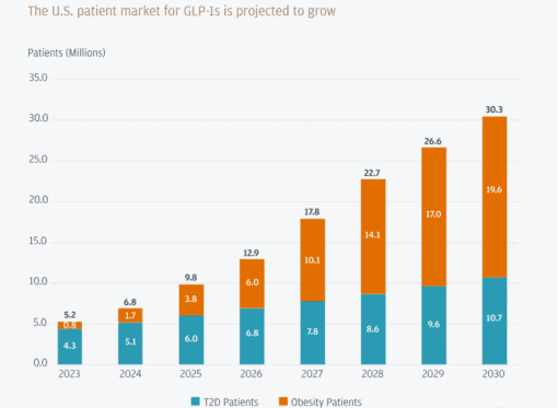 As the cost of these treatments falls and daily pill versions are released, adoption is set to soar. Indeed, JP Morgan says over 30m Americans could be taking them by 2030, up from 6.8m in 2024.