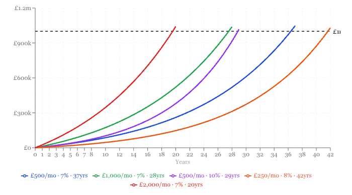5. High contributions and sprint finish £2,000 a month at 7% reaches £1m in just 20 years. The most expensive monthly commitment â but the shortest horizon.