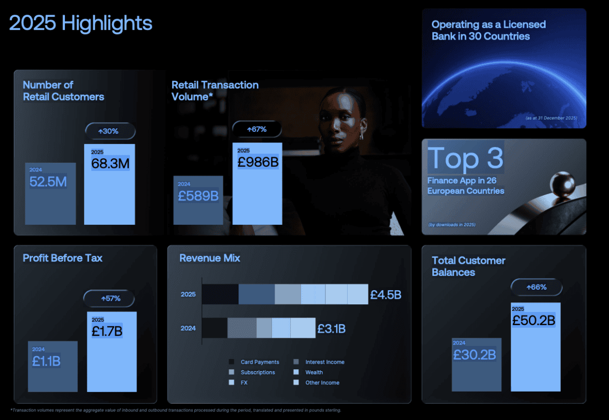 Itâs worth noting that Revolut is having success both at consumer and business level right now. At the end of 2025, it had 68.3m retail customers (+57% year on year) and 767,000 business customers (+33%).